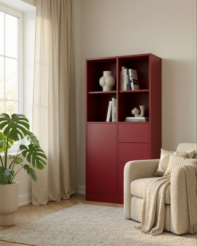 Das gezeigte Wohnzimmer-Regal in Rubinrot bringt spürbar Wärme und Ausdruck in den Raum. Die einheitliche Gestaltung sorgt für eine ruhige, harmonische Optik – und gleichzeitig ist das Möbelstück klar strukturiert.